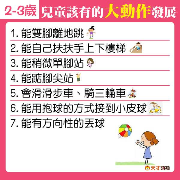 我們整理了2-6歲孩子的大動作發展表現,爸爸媽媽一起來看看寶貝發展得如何,還不太熟練的,就趁這個周末帶孩子活動活動吧~