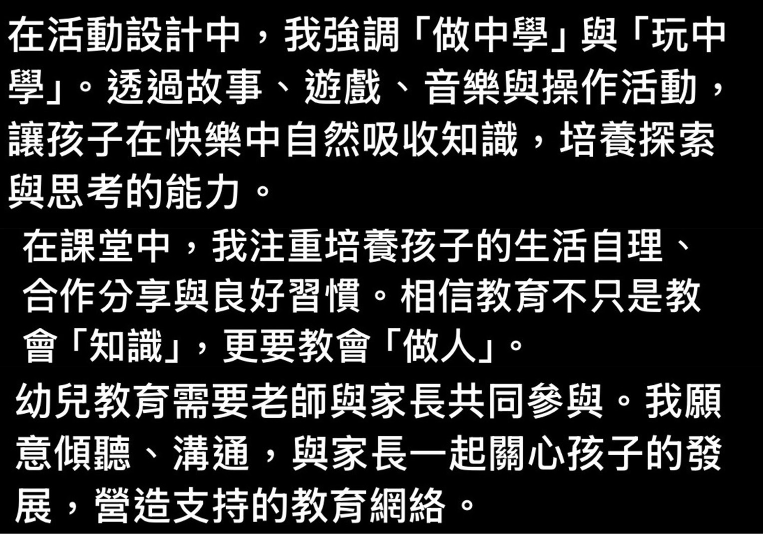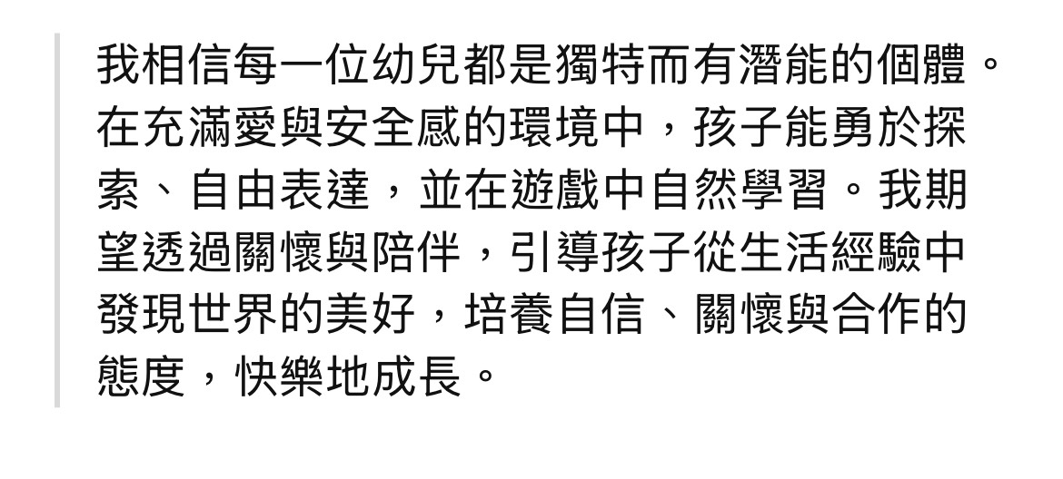 我相信教育的核心在於啟發,而非灌輸。教學不僅是傳遞知識,更是引導孩子思考、探索與實踐的過程。我致力於營造一個開放、尊重與互動的學習環境,讓孩子在安全與包容的氛圍中勇於發問、敢於挑戰、樂於學習。
